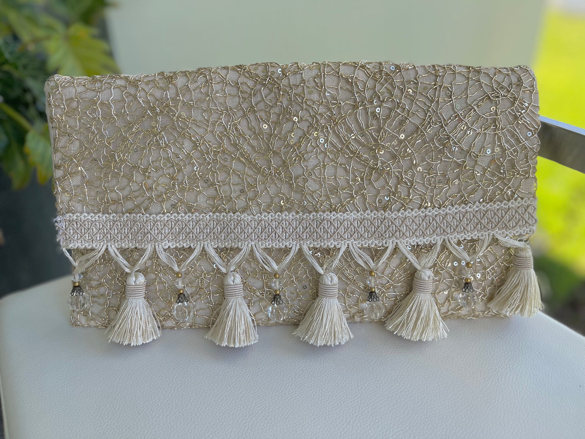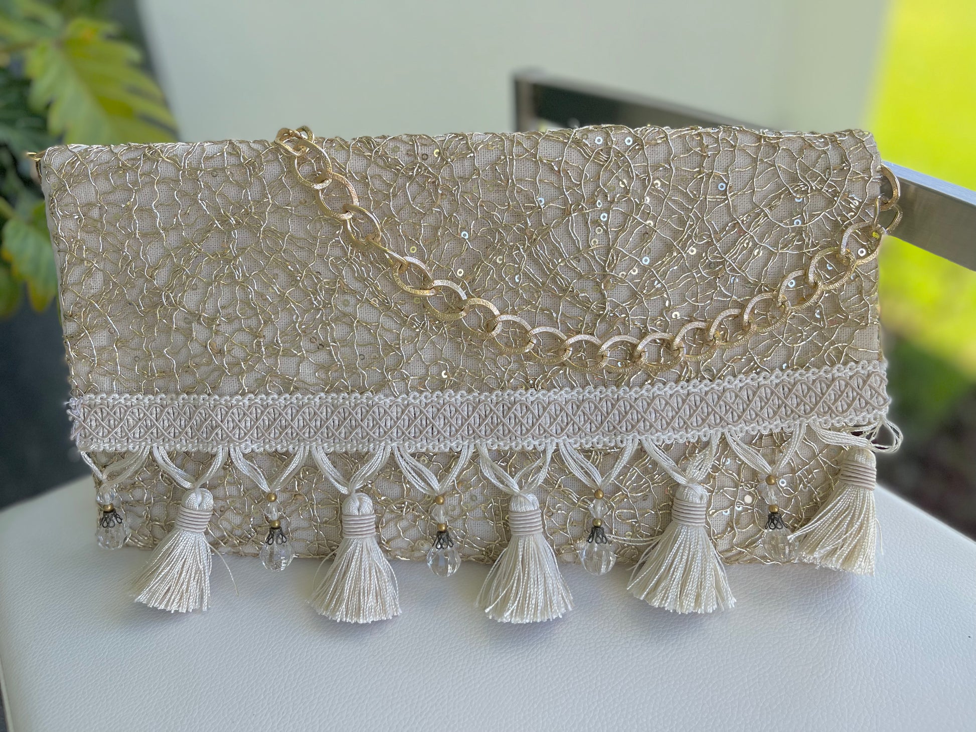 - Material: Gold Metal Mesh Frabric, Borlas